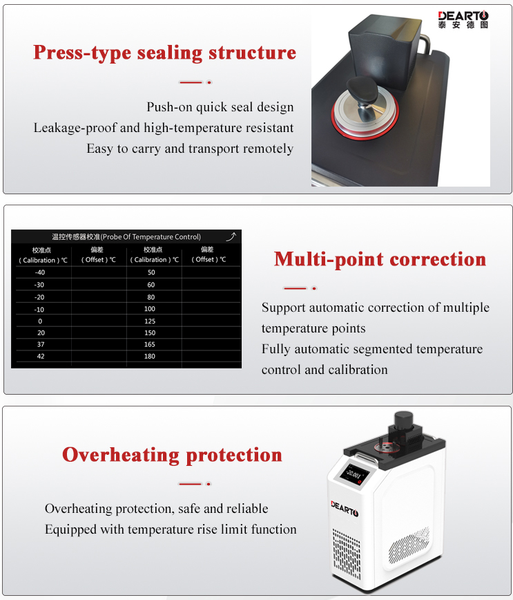 DTS-BG Portable Smart Calibration Bath is a high-precision, self-regulating temperature calibration device. It features excellent stability, a uniform temperature field, and accurate temperature control. Utilizing a fully enclosed compressor refrigeration system and intelligent PID regulation, it achieves automatic temperature control.