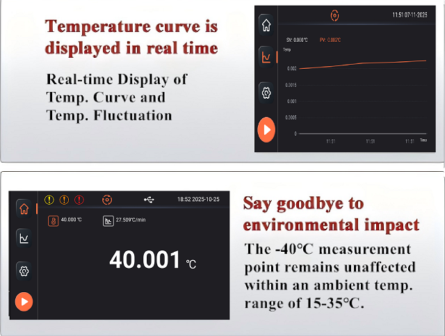 3.Smart touchscreen interface: Smart touchscreen control with 0.001°C resolution. Real-time display of temperature curve and fluctuation.